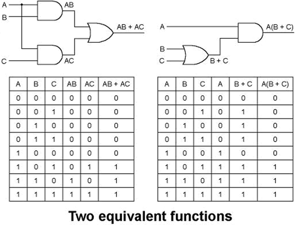 we use boolean algebra: AB + AC is equivalent to A(B+C).