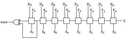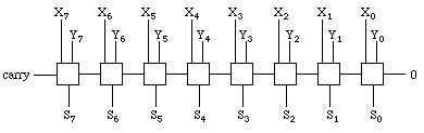 The full adder, if completely drawn at the primitive gate level, would be seen to contain 22 transistors. This would create a somewhat complicated drawing for a simple device thus, as with the half-adder, it might be convenient to represent this circuit in a block diagram, Of course, even our limited PIPPIN machine supports addition with more than a 1-bit result. It is possible to combine full adders with one another to allow larger results to be obtained. For example, to perform PIPPIN addition we would chain eight full adders together, If we wanted to make the picture more complicated we could add additional full adders until we have the full 32-bits used by most current computer systems. It's not in any way different, though, than the PIPPIN adder, just more transistors. Note also that since the PIPPIN machine uses 2's-complement representation, it is possible to check the validity of the result from an addition. Recall that 2's-complement addition is correct if the carry in and carry out from the last bit match. We could include another output bit from our circuit called an error flag. This bit would be 1 if the value is not valid, in other words if the carry in and carry out from the last bit do not match: