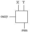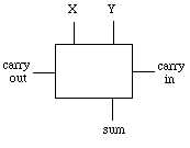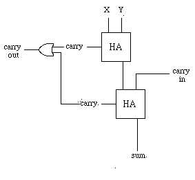 which can be represented schematically as, This circuit is called a "half" adder because it has part of the functionality of addition, sum and carry out, but it lacks the ability to "carry in" a value from the previous bit of addition. It is possible, though, to combine two half adders to provide this functionality as follows: This circuit is referred to as a full-adder. Note by examples, that all eight possible cases yield the correct result from our design: