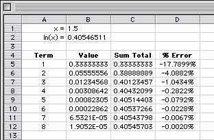 Test this method by designing a spreadsheet as follows. In the first colum simply keep track of the number of terms which have been computed for the series. As shown above, the first three terms are written out, the remaining terms follow the same pattern. In the second column compute the value for that particular term of the series. In the third column keep a running total of the sum of all terms in the series. In the fourth column show the deviation from the "actual" result by referring to the built-in LN( ) function of Excel. Your spreadsheet should be fast and easy to change to test the results for other values of x.
